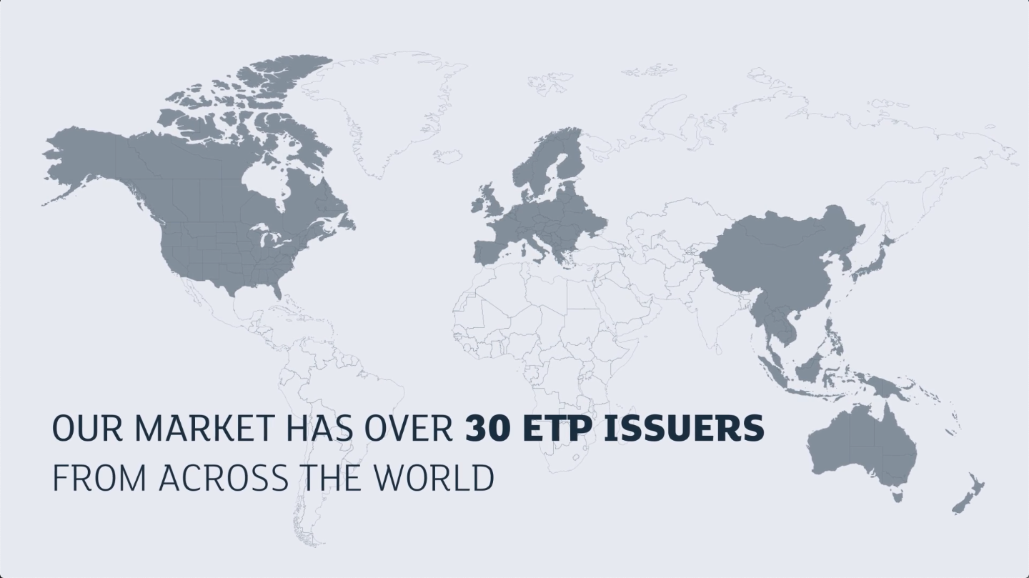 目前伦敦证券交易所是全欧洲的最大的ETP市场。伦敦有1600 以上ETP(含ETF和ETC)。除了富时100ETF之外,交易所的最流行的ETF和ETP相关大宗商品,特别的黄金, 咖啡[真香],石油, 白银和镍矿。