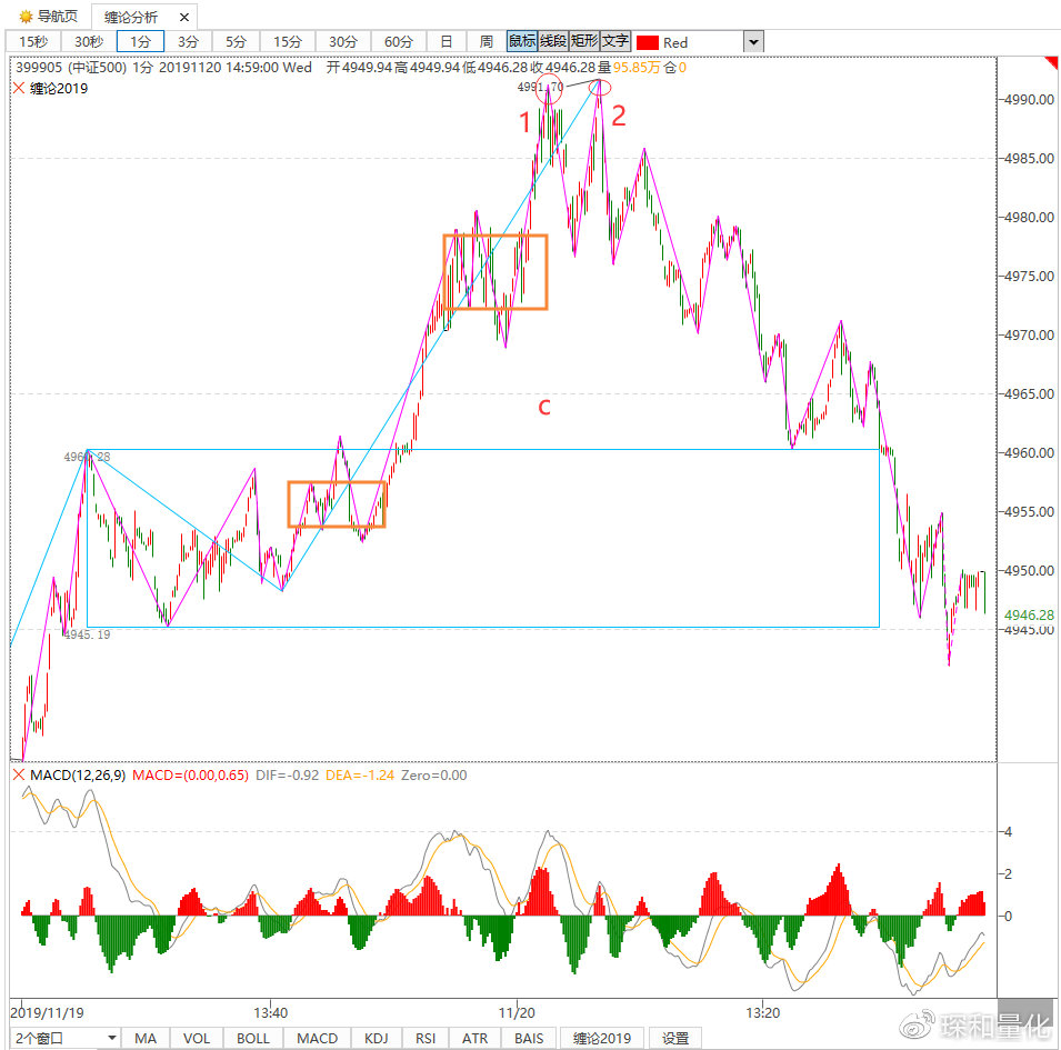 在1分钟图上(如下图),5分钟线段c在1分钟图上走了5段,其中1分钟线段c和线段b明显盘背,这是第二重背驰。现在要确认1分钟线段c结束,继续到内部看结构。