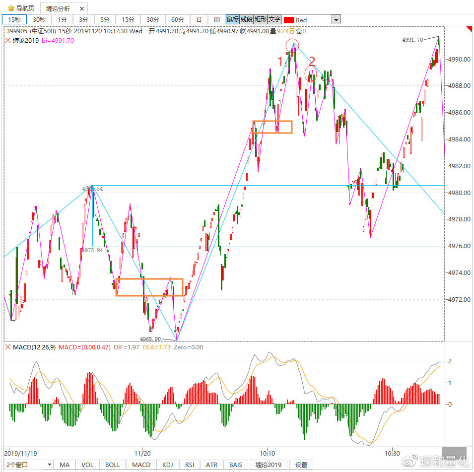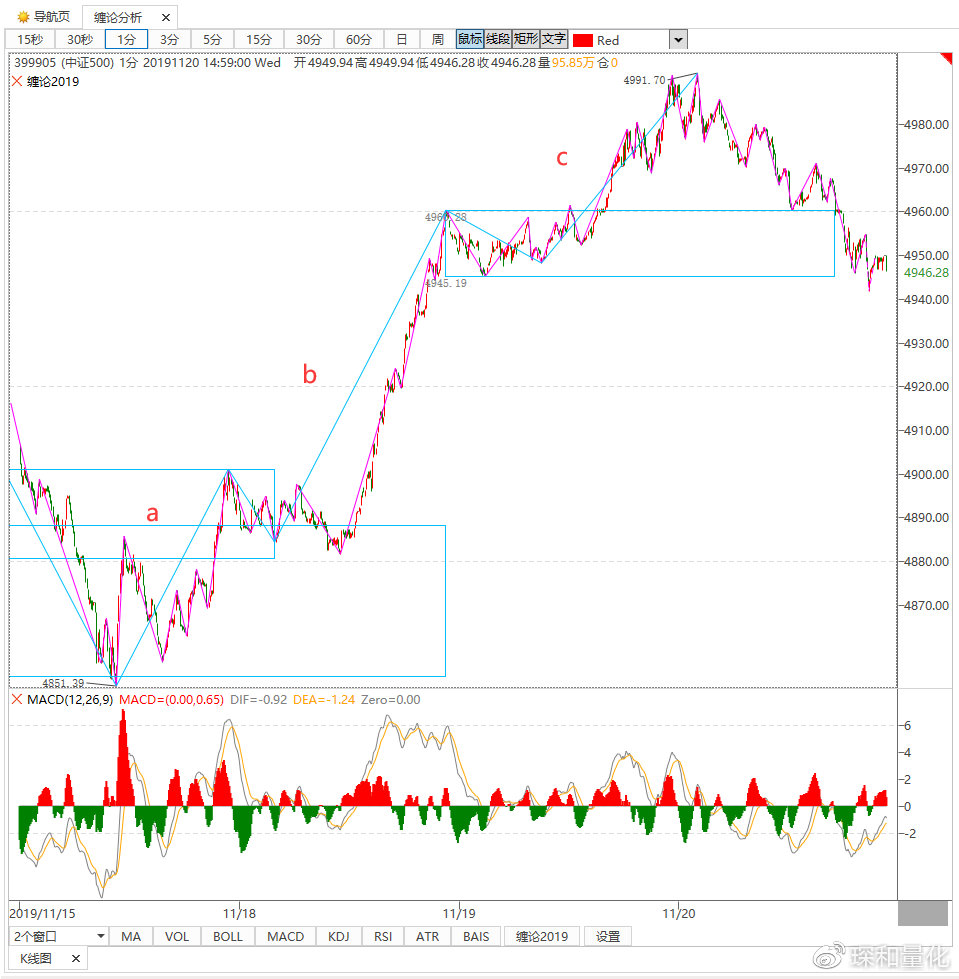 通过四重盘背驰,今天上午10点18分精确定位了中证500指数短线5分钟的盘整背驰高点。