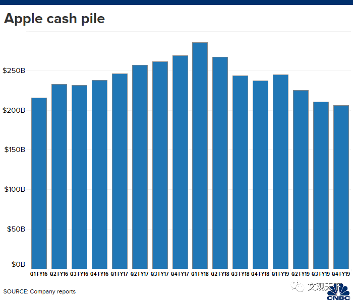 苹果公司的现金储备仍然是美国公司最高的之一,预期苹果公司将为Apple TV+流媒体服务的原创内容制作投入大笔资金。所以除非明年iPhone的销售增长更快,苹果公司的现金储备将维持自2018年以来的下降趋势。