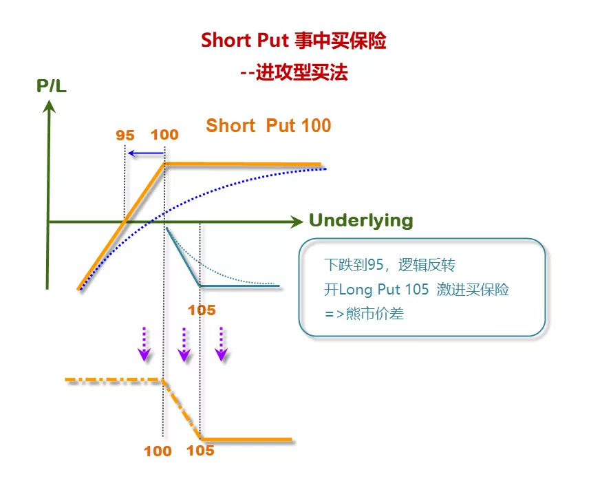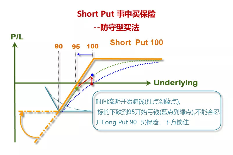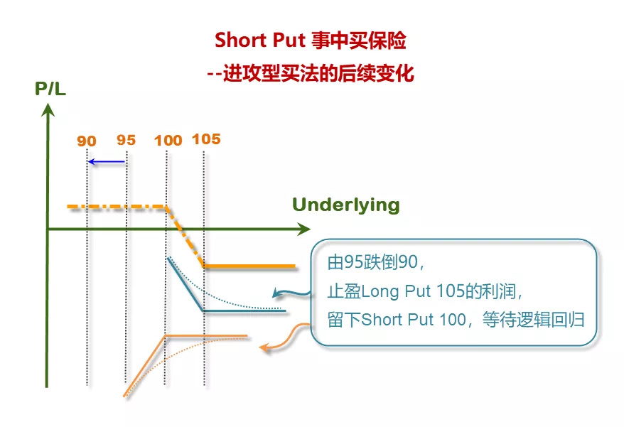 当然这个时候买Long Put保险的价格会比入场时候贵很多,但需要评估这笔交易的逻辑是否还在,如果认为逻辑还在还会上去,只是一个向下的波动,那可以不买甚至跌下来可以加仓。但如果观点是认为最终还会上去,但中间波动大得受不了,那就可以事中买保险。比如说,你在100时候Short 100 Put卖2块钱,90的Put可能只有5毛钱,但标的跌到95的时候90的Put可能要花1块五了,但是即便花1块五买90的Put 总体还是赚5毛钱。这样的好处是,只要认为逻辑还在,买上90 Put的保险随便它跌,因为最大的亏损已经锁住,只要行情回来,就还是赚钱的,这是一种防守型的买法。