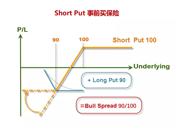 买保险,有两种买法:一种是事前买,一种是事中买。事前买保险,卖一个现价100的平值Put,但是不能容忍标的超过90的亏损,就在90的位置把风险锁死,买一个90的put,这就构成了90/100的牛市价差。