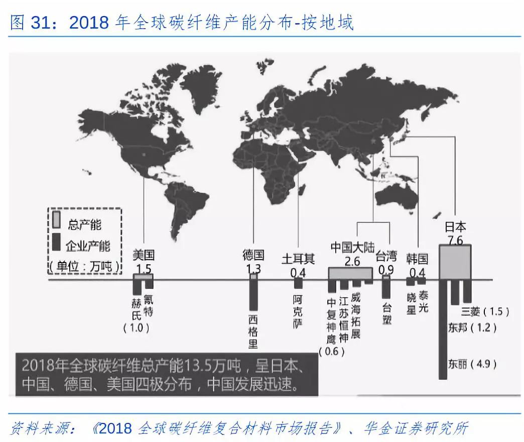 2010-2018年,全球碳纤维产能约由为约8.4万吨增长至13.5万吨。从地区来看,2018年日本生产碳纤维7.6万吨,占比56%,中国生产碳纤维2.6万吨,占比20%,美国生产碳纤维1.5万吨,占比11%,德国生产碳纤维1.3万吨,占比10%。