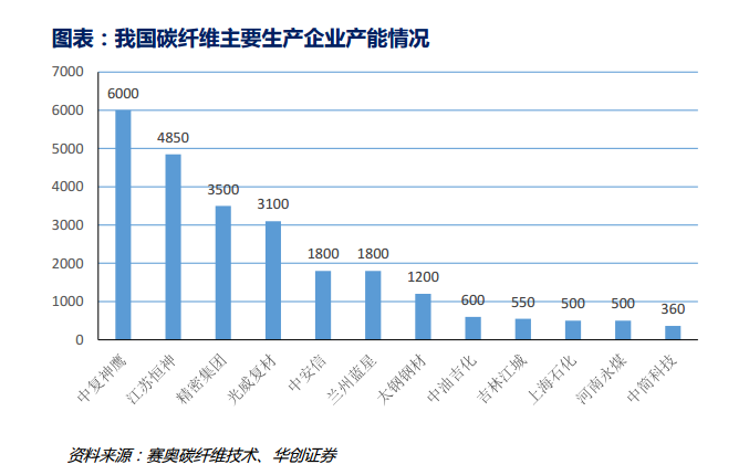 目前我国大多数碳纤维企业所提**品以中低端碳纤维为主,竞争激烈,毛利率普遍为负,长期处在亏损状态。真正掌握高性能碳纤维核心技术的国内碳纤维企业较少,仅有7家千吨级碳纤维企业达到要求。这7家企业集中度较高,理论产能已经占到了全国的84.8%,他们分别是中复神鹰、江苏恒神、精功集团、光威复材、中安信、兰州蓝星以及太钢钢科,其中中复神鹰产能最高,达6000吨。