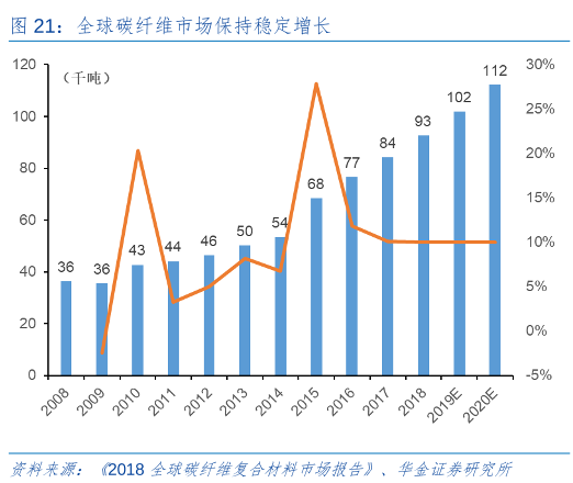 2010-2018年,全球碳纤维需求量由4.27万吨增长至9.26万吨,预计到2020年全球碳纤维市场需求将达到11.2万吨。