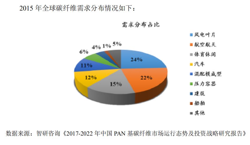 从全球碳纤维应用来看,碳纤维主要集中在航空航天,工业应用和体育休闲三大终端应用领域。目前全球碳纤维总量超过50%被应用于工业领域,其中,风电叶片占比24%,汽车领域占比12%,混配模成型占比11%,压力容器占比6%,建筑占比4%,船舶占比1%。剩下22%被应用于航空航天,不足20%被应用于体育休闲。