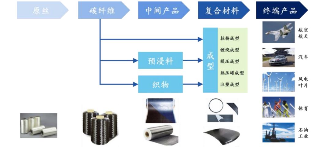 碳纤维产业链制作工序丰富,较为复杂。具体为,上游是生产碳纤维专用的材料;中游是碳纤维生产工艺中的设备提供商;下游是生产碳纤维应用部件的产品。从上游原丝到碳纤维整个过程,碳纤维经过一系列的聚合、纺丝、预氧化、低温碳化、高温碳化等过程后方可制得。除此之外,碳纤维再经过与树脂、陶瓷等材料结合,还可进一步形成碳纤维复合材料。