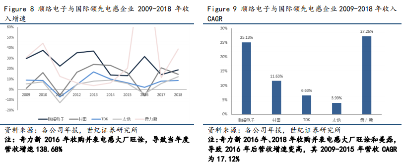 在2017年全球电感市场中,前六大厂商占58.10%,其中顺络电子份额占比达6.7%,排名第五。顺络电子近年营收复合增长率大幅领先于日本及台湾大厂,追赶势头明显。