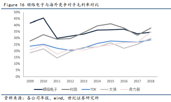 因在生产成本和费用方面管控得力,公司的产品价格相比村田等日系厂商更低,部分产品价格甚至可以比村田低30%以上,在国际市场上具备价格优势。在这种情况下,公司的盈利能力仍能领先全球,与国外企业对比,公司毛利率远高于TDK、太诱、奇力新等,与村田的毛利率比肩。
