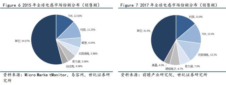 近年来随着电感领域的核心竞争力“技术”和“成本”领先等因素影响,电感领域的市场集中度呈现逐渐提升,全球前六大电感厂商的市占率由2015年的45.93%上升至2017年 的58.10%。