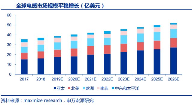 2018年全球电感市场规模37亿美元,预计未来电感市场将保持平稳增长,2026年将达到52亿美元,18-26年复合增长率达4.29%。分区域来看,亚太地区为全球最大市场,且成长性最佳,预计2026年份额将超50%,主要由中国市场贡献。