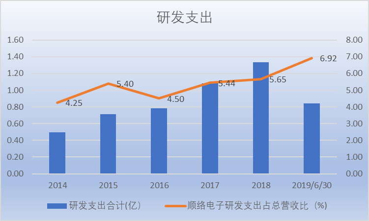 技术不断进步的背后是公司持续高强度投入研发,公司的研发投入占营收比处于不断提升的趋势,截至2019 年上半年公司研发支出占比已上升至6.92%,为 5G等新应用趋势做好了充足的准备。