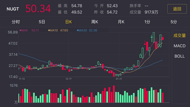先看下NUGT,日线如此凶悍,到本周四(2月18日),一个月涨了164.48%。