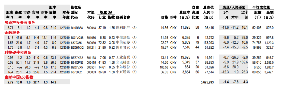 根据富时公司的最新月度报告,A50指数的最新行业权重分布是这样的: