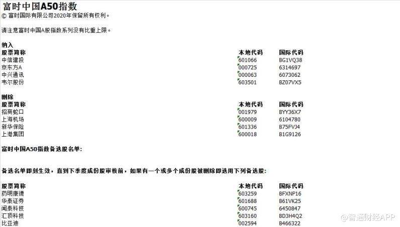 A50的成分股,在2020年有调整,具体名单是这样的,你会发现,里面的成分编制都是一些大市值对经济发展有很大贡献权重的经济体。