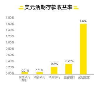 收益率远超银行:我们统计了闲钱管家上线以来的(2019.09.-2020.06)历史收益率,得出年化收益率在1.6%左右。这个收益率处于什么水平呢?我们对当前美元活期存款收益率进行了统计,对比一下你就清楚了。