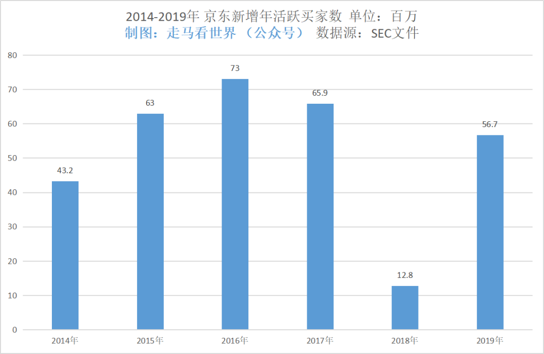 - 虽然2018年京东水逆,但是年度新增GMV倒是没有下降,还比2017年略微多增长了200多亿,这说明了京东的核心用户并没有在当年抛弃京东,丑闻事件影响的是一批非核心用户和潜在用户——本可能进入京东平台而放弃了。而且这批核心用户该年度内的年度消费总额上升了不少,不然在总用户几乎没有增长的情况下,GMV不可能增加3800多亿。