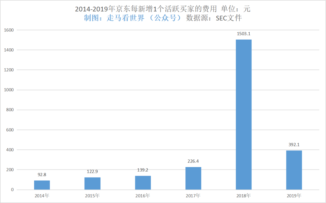 - 2018年是京东的水逆之年,年度活跃买家数全年净增才1280万,创历史新低记录,水涨船高的是该年度内的单用户费用达到了可怕的1503元。