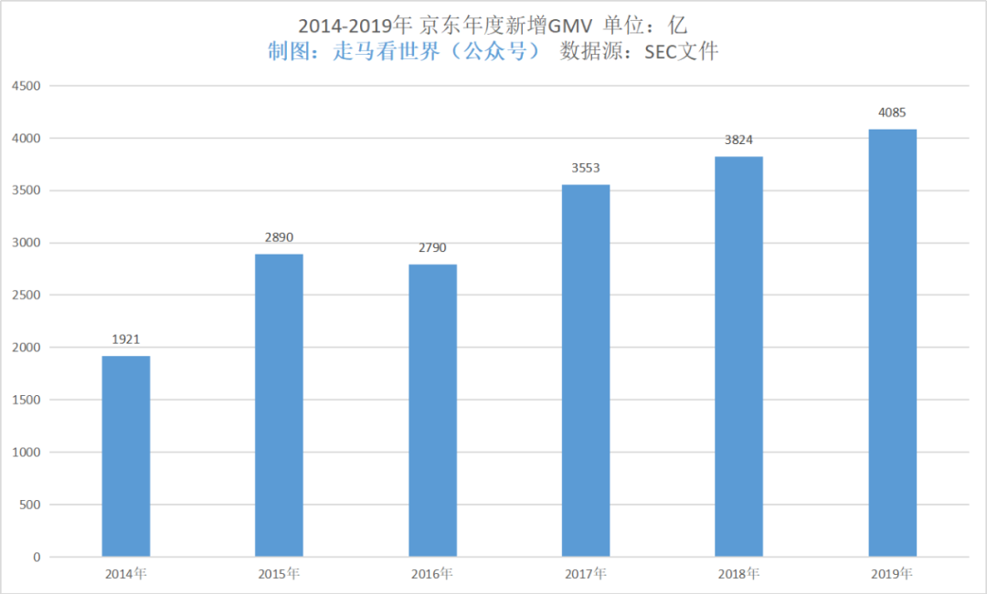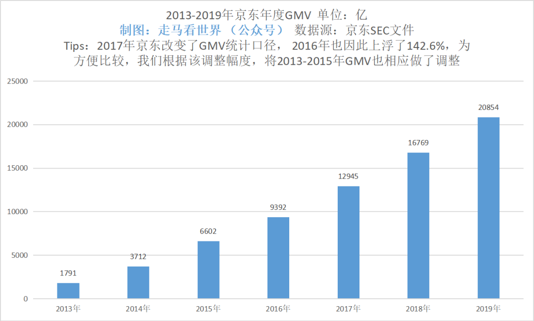 2017年Q3季度,京东改变了GMV统计口径,根据此前的年报和季报,2016年的GMV是6582亿,新口径后,2016年GMV调整为9392亿,是原数据的142.6%。为了方便统一比较,我们将2013-2015年的GMV也相应的上浮为财报数据的142.6%。(根据京东年报SEC文件,2013-2016年的GMV数据原本分别为1255亿、2602亿、4627亿、6582亿)