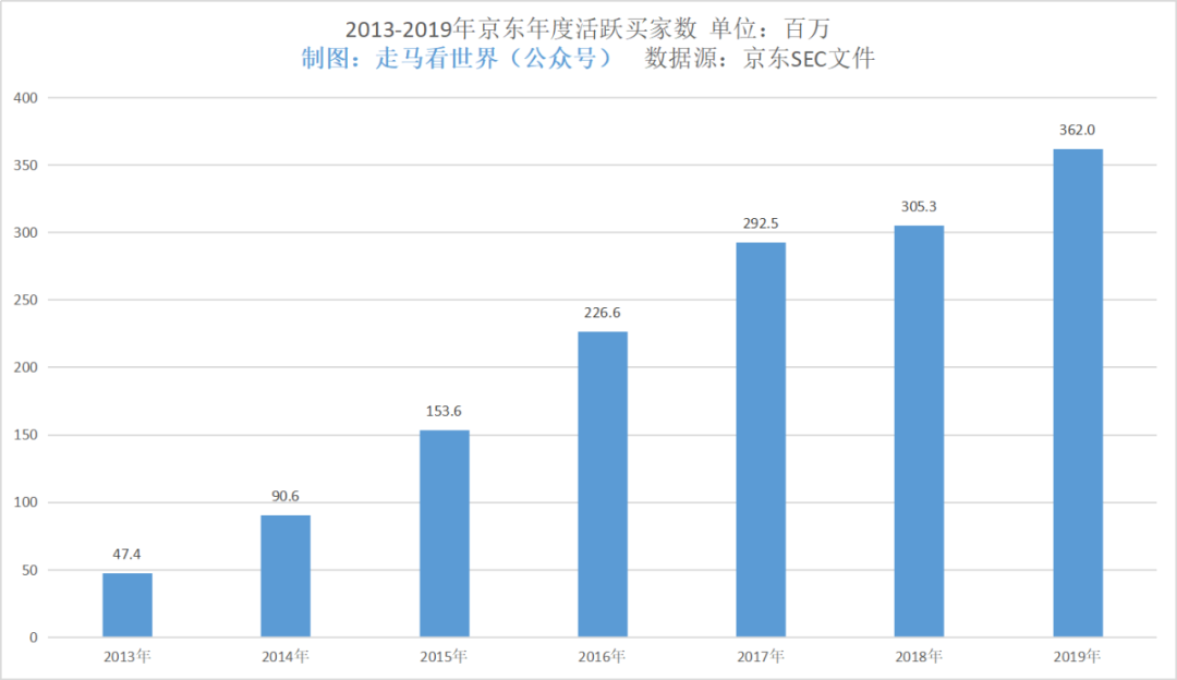 然后看看2013-2019年的京东年度GMV和年活跃买家数。