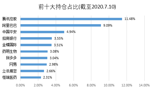 前十持仓基本都是我们耳熟能详的公司,有腾讯$腾讯控股(00700)$ 、阿里巴巴$阿里巴巴(BABA)$ $阿里巴巴-SW(09988)$ 、中国平安$中国平安(601318)$ $中国平安(02318)$ 、招商银行$招商银行(600036)$ $招商银行(03968)$ 、网易$网易(NTES)$ $网易-S(09999)$ 、中国邮政$邮储银行(01658)$ 等,覆盖中国A股,港股和美股三大市场。投资的H股比例美国中概股的比例分别达到52%和20%。