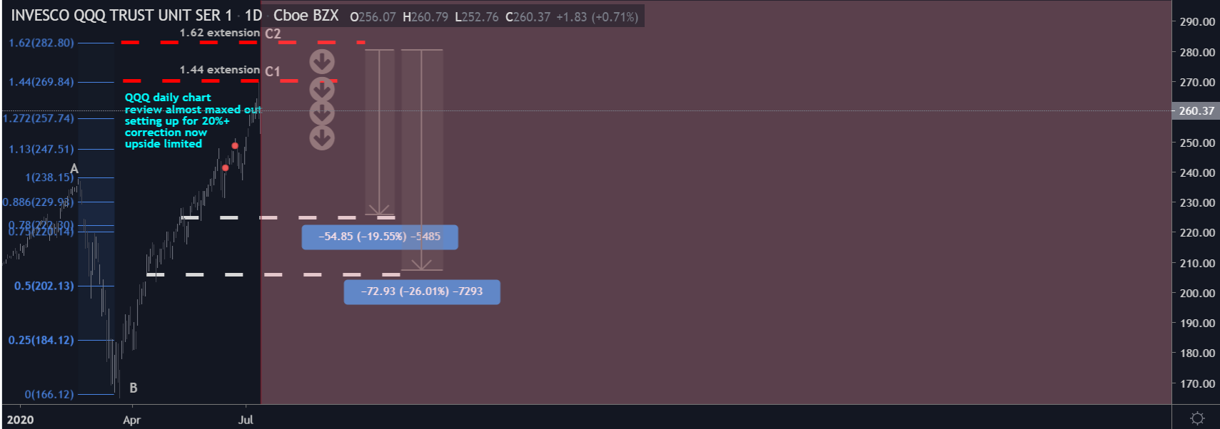 纳指日线图上也有见顶形态,两个回调目标位都在下图里面了: