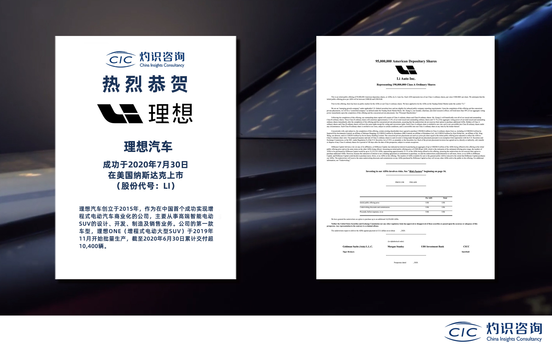 2020年7月30日,理想汽车正式在美国纳斯达克挂牌交易,股票代码为“LI”。$理想汽车(LI)$ 理想此次IPO的承销商包括高盛、摩根士丹利、瑞银和中金公司。理想汽车发行定价每股11.5美元,募资10.925亿美元,高出每股8-10美元的定价指导区间,这是自2018年3月爱奇艺在纳斯达克进行的24亿美元IPO以来,中国公司在美国的最大IPO。此外,美团、字节跳动以及美团两位联合创始人王兴和王慧文四名现有股东通过私募方式认购价值3.8亿美元的A类普通股。公司将把筹集的大部分资金用于资本支出和新产品的研发。CIC灼识咨询作为行业顾问,助力理想汽车定位其所在中国新能源汽车市场的领先地位,并全力协助公司美国上市的全过程。