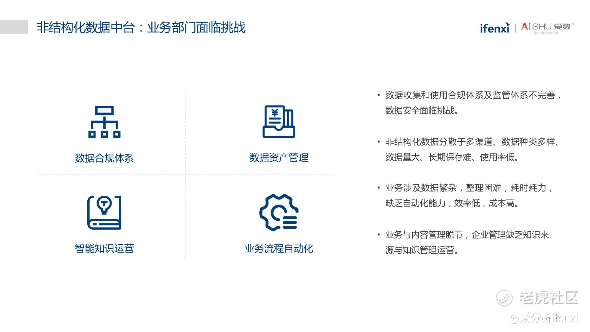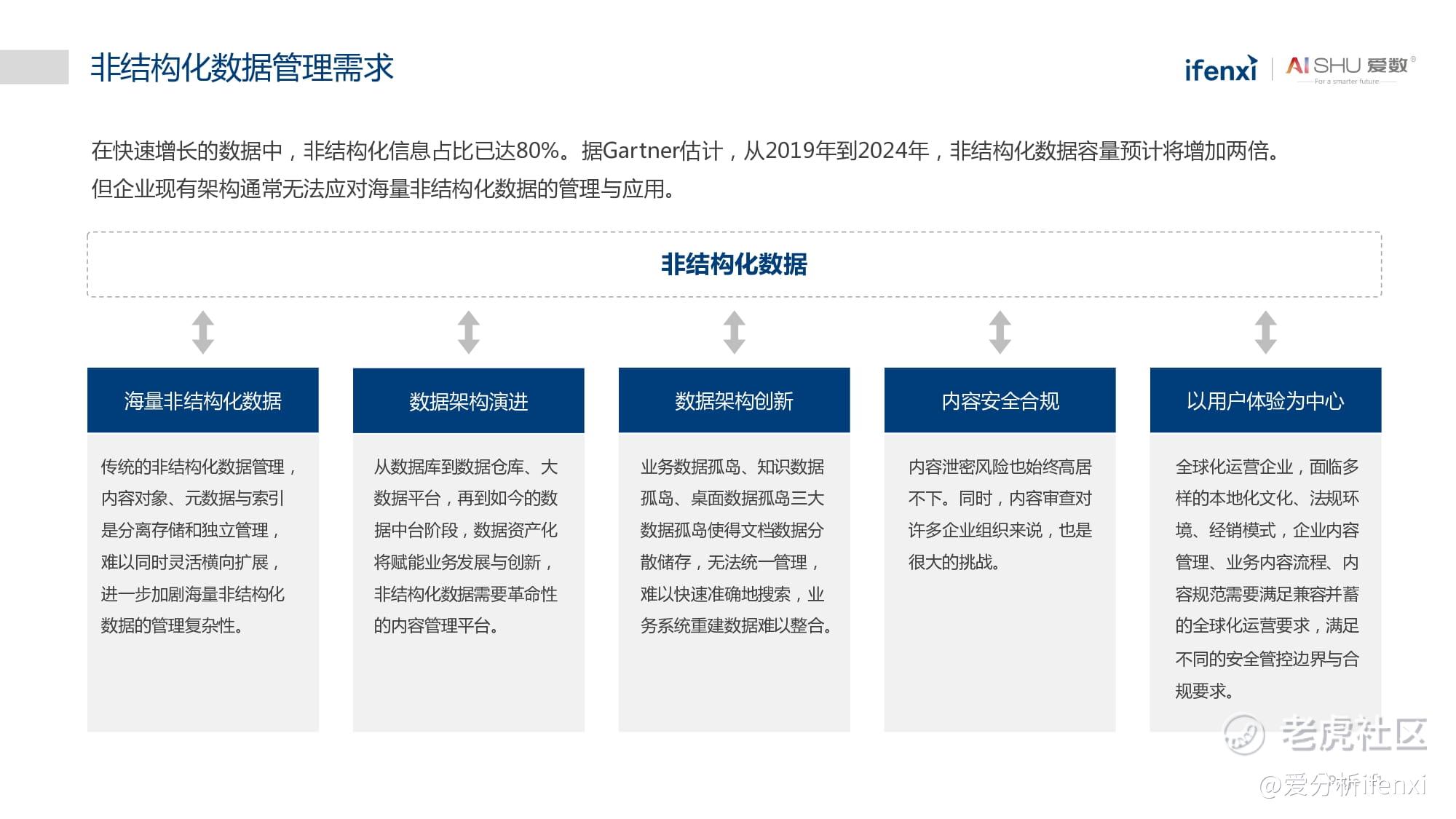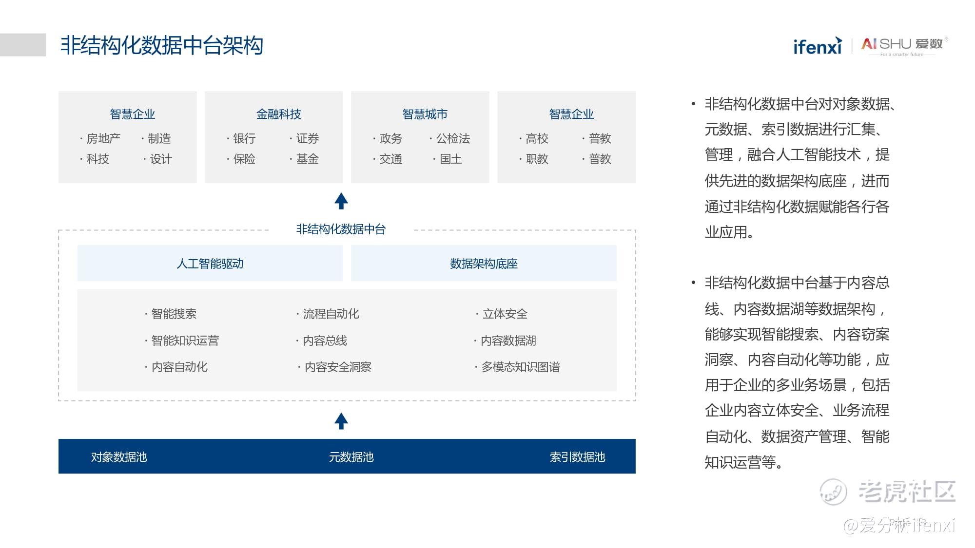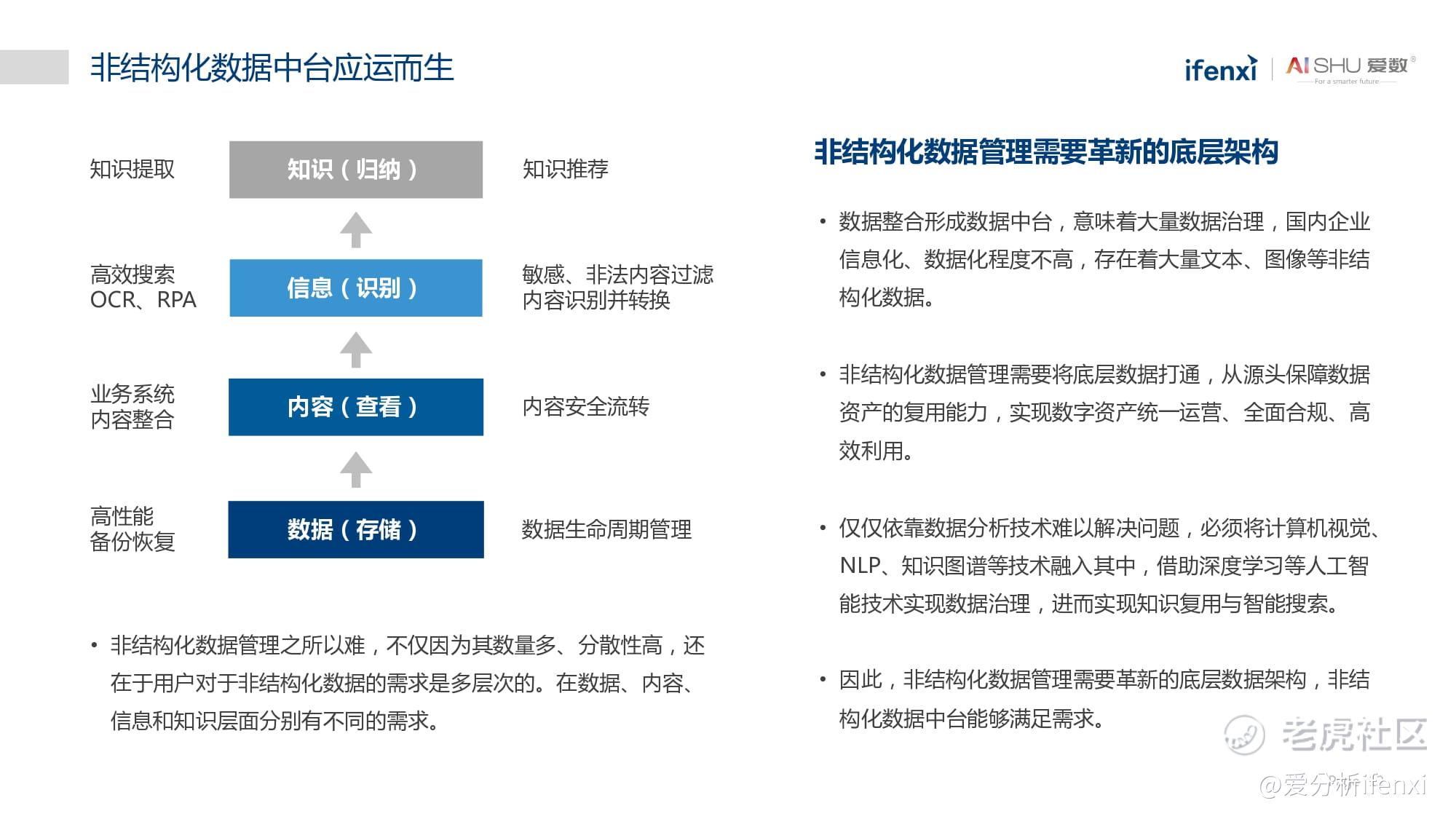 针对非结构化数据中台,大数据基础设施提供厂商爱数联合爱分析发布了《中国非结构化数据中台实践白皮书》(以下简称“白皮书”)。白皮书总结了企业面临的海量非结构化数据的业务痛点以及解决方案,展示了非结构化数据中台的多场景应用实践案例,并探讨了行业未来发展趋势。