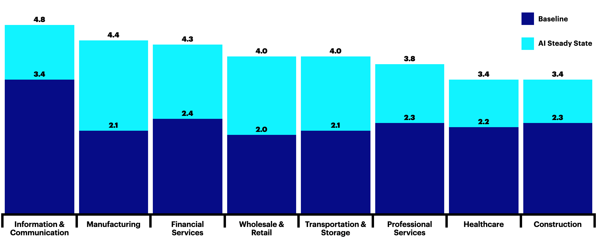 根据Accenture的预测,到2035年,AI将对金融服务行业、信息和通讯行业、制造业、专业服务行业以及批发零售行业等14个行业分别增加超万亿美元规模的生产力。2035年,AI技术平均将会提高上述14个行业的利润率三十八个百分点,并能给这14个行业总共带来14万亿美元的市值加成。$埃森哲(ACN)$
