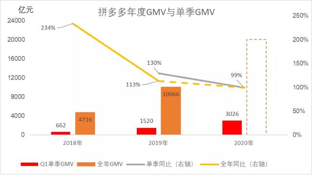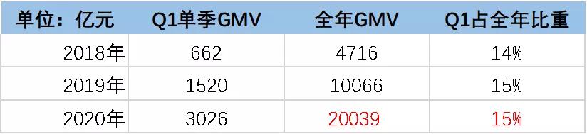 据拼多多上市招股书披露,2018年第一季度的GMV为662亿元,由此,根据后续逐季披露的前12个月滚动GMV可以推算出2019年第一季度GMV为1520亿元,同理根据拼多多最新披露的2020年3月31日的过去12个月期间GMV则可推算出拼多多2020年第一季度的GMV为3026亿元。