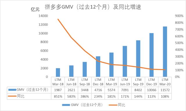 $拼多多(PDD)$ (NASDAQ:PDD)今日发布2020年第一季度财报。财报显示,截至2020年3月31日的过去12个月期间,拼多多平台交易额(GMV)达11572亿元,较上年同期的5574亿元同比增长108%,延续了翻倍增长态势。这意味着,拼多多2020年第一季度的GMV为3026亿元,同比增幅达99%。