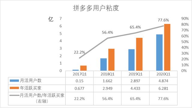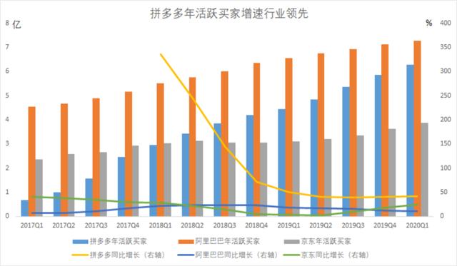 截至2020年3月31日,拼多多的年活跃买家数已达6.28亿,单季新增4290万,相比2019年同期,增加了1.85亿。