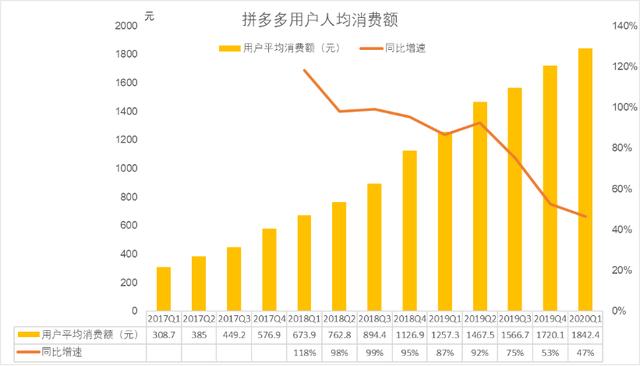从财报披露的其它数据来看,推动GMV的快速增长主要得益于用户高增速和人均消费额的提升。一季度,拼多多在用户增长方面延续了一贯的亮眼表现,年度活跃买家数已达6.28亿,同比增速42%,单季新增4290万。同时,整体用户粘性持续增强,且单个活跃买家平均消费额稳步提升至1842.4元,较上年同期的1257.3元同比增长47%。据当前趋势预计,2020年拼多多全年GMV或大概率将突破2万亿元。