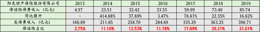 阳光保险在2012年成立信用保证保险事业部,以“信用保证险+银行贷款”的业务模式经营,随后的2014年,其保证险保费收入达23.51亿元,同比大增414.88%;大地财险在2015年成立个人贷款保证保险事业部,2016年保证险实现保费收入12.95亿元,同比大增365%。