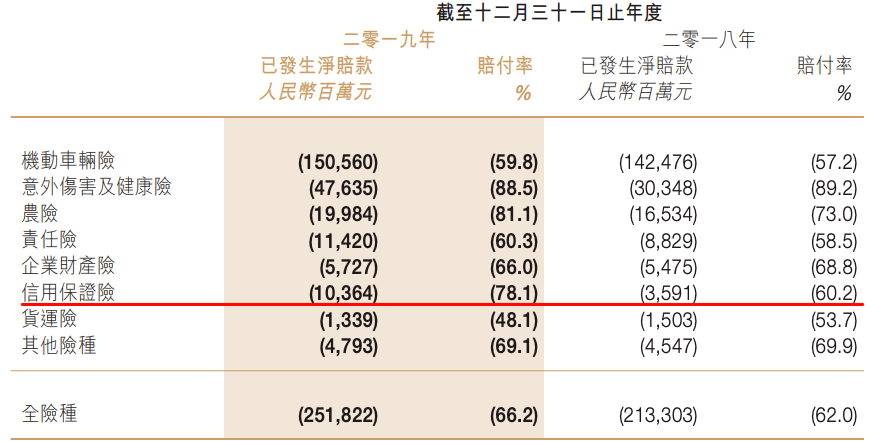 然而,金融领域的风险往往是滞后的,虽然其信用保证险保费收入在2019年依然维持高增长,但多个关键指标已明显恶化。