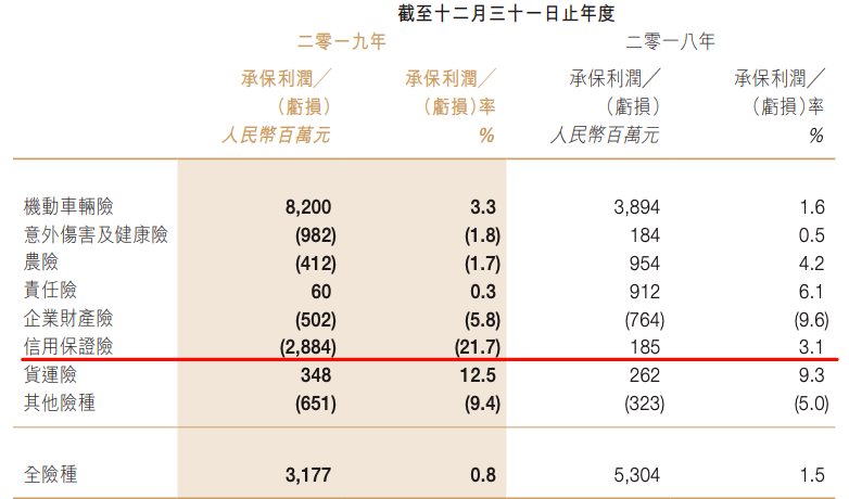 2019年,人保财险信用保证险实现保费收入227.67亿元,但承保利润出现28.84亿元的巨亏,继2018年扭亏后再次陷入亏损,且严重拖累公司业绩。2019年,公司全险种承保利润31.77亿元,较2018年同比下降超40%。