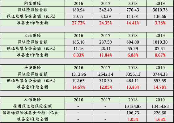 此外,据财报,人保财险信用保证险准备金余额与信用保证险保险金额的比例仅有不到2%。而另外三家财险公司该数据主要集中在6%-15%。人保财险的赔付压力可以想而知。