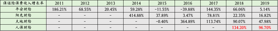 从财报数据观察,另外三家财险公司保证险保费收入增速在近几年均呈明显下降趋势,特别是在2019年,增速已经降到较低水平。