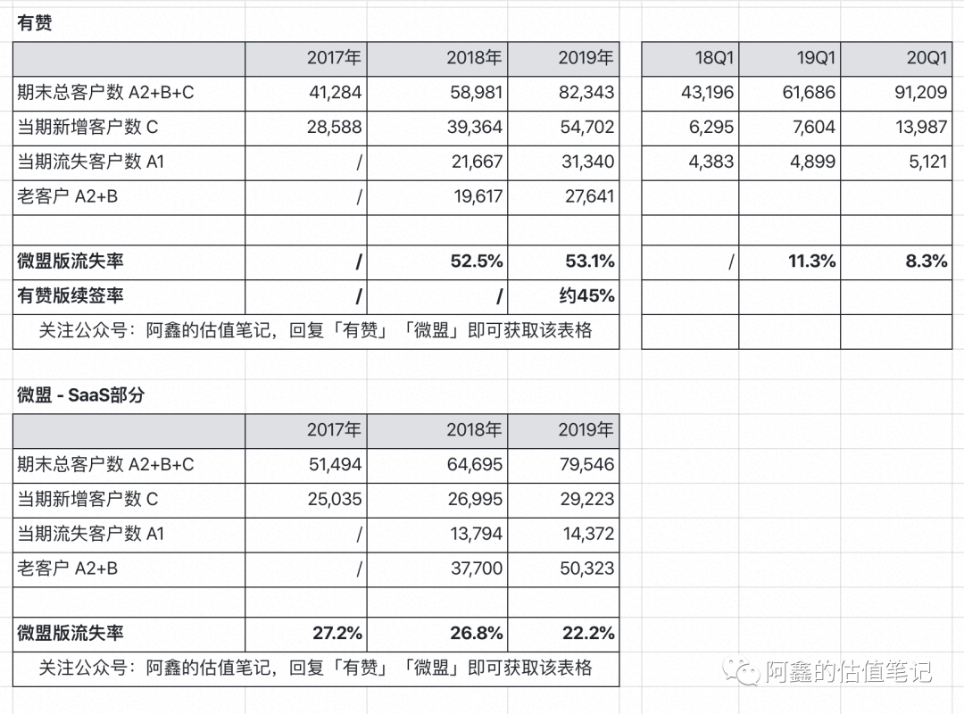 对于投资者,推荐使用流失率来进行比较。一般来讲,企业内部管理可能会采取有赞版的续签率,它是衡量续签团队业绩很直观的指标;不过受限于财报信息披露的详细情况,A2部分很少披露,而流失客户数可以推算出来,流失率更容易获取,方便投资者进行横向比较。