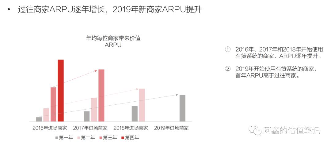 老客户产生的效益往往更高。前文(电商股系列2:有赞和微盟的竞争格局好不好?)提到过SaaS企业客户中天然会存在一批中小商家,中小商家因为自身经营的原因,生存周期很短(往往只有两三年),需要不断的拉新。因此保住平台上已经成长起来的商家不流失,这些留存的老商家就能为SaaS企业贡献更多的收入。例如有赞展示的这份数据,也可以看出每个留存老商家带来的价值,会逐年提升。