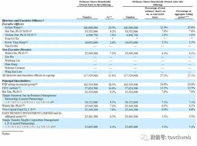 IPO前,泛生子CEO Sizhen Wang(王思振)持股为29.5%,为大股东;泛生子首席科学家阎海持股为9.2%,泛生子CTO焦宇辰持股为1.9%;Weiwu He, Ph.D.持股为7.2%。泛生子COO洪颖持股为2.8%。