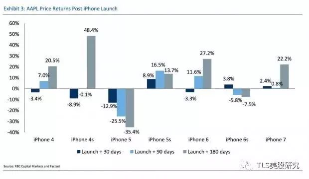 通过观察之前苹果发布会的表现,我们发现苹果股价通常在发布会后30天到90天内较为疲软,而在发布后的180内表现强劲(iPhone 5除外),因此,发布会后的3个月后通常是一个转折点,是一个较好的入场时机。