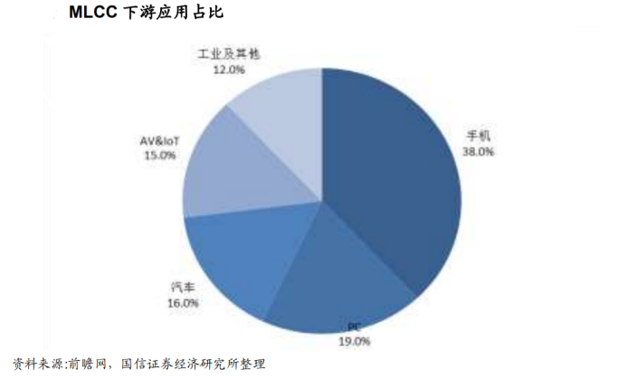 MLCC 具有体积小、频率范围宽、寿命长、成本低的优良特性,被应用广泛于手机、PC、汽车、影音及 IOT、工业等领域。手机是 MLCC 的最大应用领域,占比达 38%,手机电子主要采用 0201、01005、008004 等小型尺寸高频产品;汽车是另一个正在增长的市场,在汽车电子领域,应用最多的是 0603、0805、1206 等大尺寸产品,对于产品的耐高温、可靠性提出了高要求。
