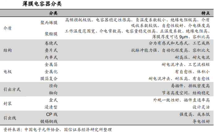 薄膜电容的种类很多,按介质可分为:聚丙烯电容器、聚乙酯电容器,聚苯乙烯电容器、聚碳酸酯电容器等;按结构可分类为卷绕式、叠片式、内串式;按电极分类为金属箔、金属化(铝金属化、铝锌金属化)、膜箔复合结构;按电极引线方式分为轴向、径向;按封装方式分为:盒式、浸渍型、裸装。按用途可以分为通用(直流)、交流与脉冲、抑制电源电磁干扰、精密、交流(电机启动、电力等)五类。