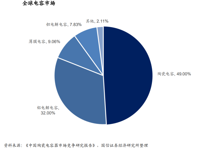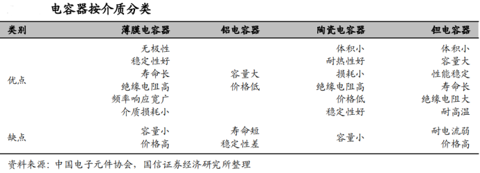 根据材质的不同,电容器可分为陶瓷电容器、铝电解电容器、钽电解电容器、和薄膜电容器等。其中薄膜电容器频率特性好、耐压能力高,并具有自愈性和无感特性,因此多用于家电、通讯、照明、电源、风力发电、光伏发电、以及新能源汽车。但由于价格较为昂贵和难以小型化,所以在电容市场占比 9.06%,位列第三。