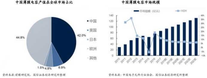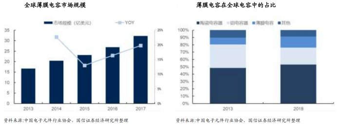 中国已经成为全球最大的薄膜电容市场和产地。全球薄膜电容市场快速、稳健增长。根据中国电子元件行业协会数据,2013-2017 年间,全球薄膜电容产值由 16.8 亿美元上升至 32 亿美元,年复合增长率高达 17%。同时,薄膜电容产值在整个电容行业中的占比由 13 年的 9.06%上升至 2017 年的 15%,呈现快速、稳定增长。