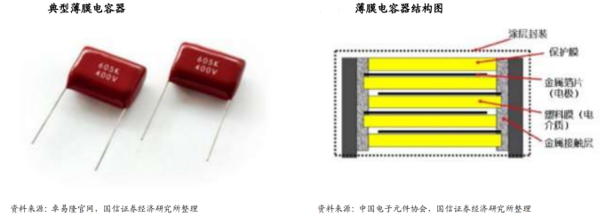 薄膜电容器又称为塑料薄膜电容器,以金属箔片作为两端的电极,电极中间是聚乙酯、聚丙烯、聚苯乙烯或聚碳酸酯等塑料薄膜,金属电极片从塑料薄膜两端重叠,整体卷绕后形成薄膜电容器。薄膜电容器主要由绝缘电介质、电极、电极过渡、引出线、封装、印章标志等部分组成。