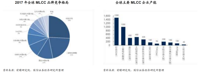 MLCC 行业亟待国产替代先锋。全球市场份额高度集中于日韩厂商。纵览 MLCC全球市场,市场份额呈现高度集中,CR5 接近 80%。从市场份额及产能可以看出,村田、三星电机优势明显,为第一梯队;国巨、太阳诱电、华新科处于第二梯队;宇阳、风华高科、三环集团等中国大陆企业位于第三梯队。