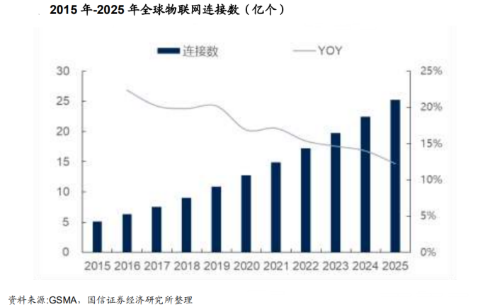 5G 时代将有海量物联网终端接入。物联网是将各种信息传感设备与互联网结合起来而形成的一个巨大网络,可以实现在任何时间、任何地点,人、机、物的互联互通,对速率、时延要求高,而 5G 技术能满足 IoT 对于网速、稳定性等方面的要求,5G 时代将有海量物联网终端接入,预计到 2025 年全球物联网设备联网数量将达到 252 亿,2020 年至 2025 年间 CAGR 为 14.66%。