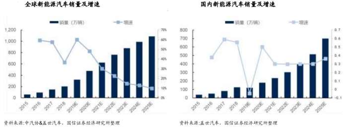 中国一直是全球范围内最大的新能源汽车消费国,占比高于 50%。2019 年之前国内新能源汽车呈爆发增长态势,据中汽协数据,2015 年国内销量仅为 37万辆,到 2018 年已经增长至 126 万辆,年复合增长率高达 50.44%。2019 年受新能源汽车补贴下坡影响,首次出现负增长,预计未来随着新能源汽车补贴政策回暖,国内市场将恢复高速增长的态势,销量将于 2025 年突破 700 万辆。